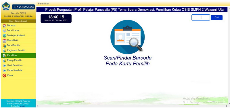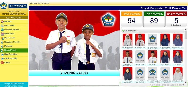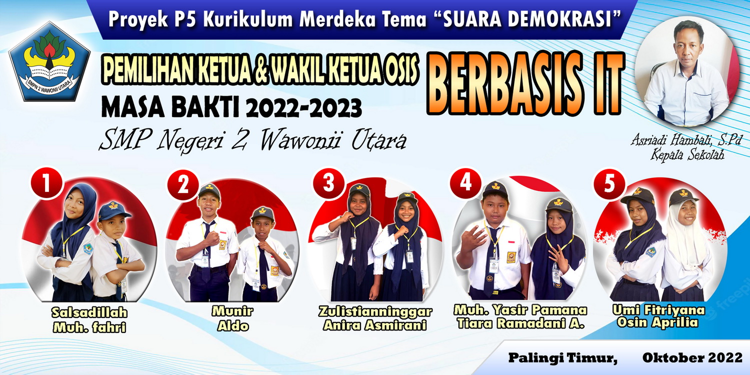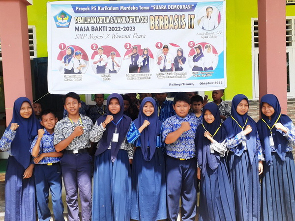 Rabu, 12 Oktober 2022, SMP Negeri 2 Wawonii Utara menggelar pelaksanaan pemilihan Ketua dan Wakil Ketua OSIS masa bakti 2022/2023 berbasis IT. Kegiatan pemilihan ketua dan wakil ketua OSIS SMP Negeri 2 Wawonii Utara menjadi salah satu Proyek Penguatan Profil Pelajar Pancasila (P5) Kurikulum merdeka untuk tema SUARA DEMOKRASI. Pelaksanaan pemilu OSIS tahun ini berbeda dengan tahun-tahun sebelumnya karena dilaksanakan dengan memanfaatkan peralatan IT berupa 2 buah PC ALL In One, 1 buah laptop, 1 buah LCD dengan alat input 3 buah Barcode Scanner. Ide dan pembuatan Aplikasi Pemilu OSIS ini murni dikerjakan dan dikembangkan sendiri oleh SMP Negeri 2 Wawonii Utara. Foto bersama panitia pelaksana Pemilu OSIS, Guru dan Kepala Sekolah "Dengan aplikasi Pemilu OSIS, data pemilih dan hasil pemilihan terdokumentasi secara elektronik, jumlah pemilih dan yang belum memilih dapat ditampilkan secara real time, hasil pemilihan langsung dapat dilihat tepat setelah pemilihan usai sehingga kecurangan secara otomatis dapat diantisipasi. Kegiatan ini juga dapat memberikan gambaran kepada peserta didik tentang bagaimana kegiatan pemilihan yang akan dilaksanakan di masa-masa yang akan datang." Ujar Asriadi hambali sekalu Kepala Sekolah. Kandidat Calon Ketua dan Wakil Ketua OSIS Kegiatan pemilu OSIS berbasis TIK ini sepenuhnya dilaksanakan oleh peserta didik. Peserta didik SMP Negeri 2 Wawonii Utara terlibat secara aktif baik sebagai pasangan calon, panitia, maupun sebagai partisipan yang berhak menggunakan suaranya untuk memilih pasangan calon yang diyakini mampu mengemban amanah sebagai ketua dan wakil ketua OSIS masa bakti 2022/2023. Melalui Pelaksanaan Pemilu OSIS Berbasis TIK ini, Peserta didik diharapkan dapat melaksanakan tugasnya secara mandiri, mengutamakan prinsip gotong royong, menetapkan pilihan tanpa memandang SARA, berpikir kritis dalam menyelesaikan permasalahan yang timbul, serta kreatif dan inovatif yang telah ditunjukkan dengan melaksanakan pemilu OSIS berbasis IT. Panitia depan ruang pelaksanaan Pemilu OSIS Registrasi Pemilih dengan cara panitia menscan kartu peserta didik (kartu pemilih) menggunakan Barcode Scanner Ruang Tunggu Pemilih Bilik Pemilih, Peserta didik menscan kartu pemilih (kartu siswa) dan kandidat pilihan menggunakan Barcode Scanner Jumlah peserta didik SMP Negeri 2 Wawonii Utara sebagai pemilih terdaftar sebanyak 94 orang. Saat pelaksanaan pemilihan, 89 peserta didik menggunakan hak suaranya sedangkan 5 lainnya tidak menggunakan hak suara karena berhalangan hadir. Berikut screenshot hasil Pemilu OSIS SMPN 2 Wawonii Utara masa Bakti 2022-2023 : Hasil Pemilihan Ketua dan Wakil Ketua OSIS Masa Bakti 2022-2023 Suksesnya kegiatan pemilihan OSIS SMPN 2 Wawonii Utara berbasis TIK ini, semakin menambah jumlah inovasi IT yang telah dilakukan SMP Negeri 2 Wawonii Utara. Tampilan Aplikasi Pemilu OSIS SMP Negeri 2 Wawonii Utara (atm)