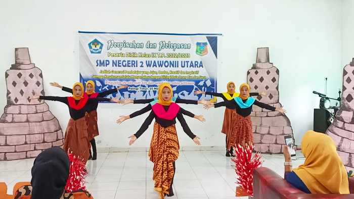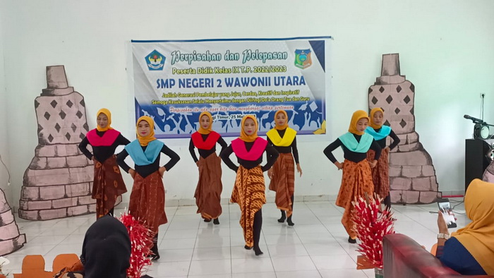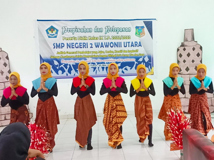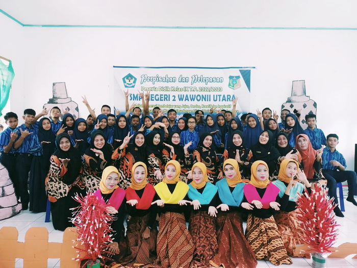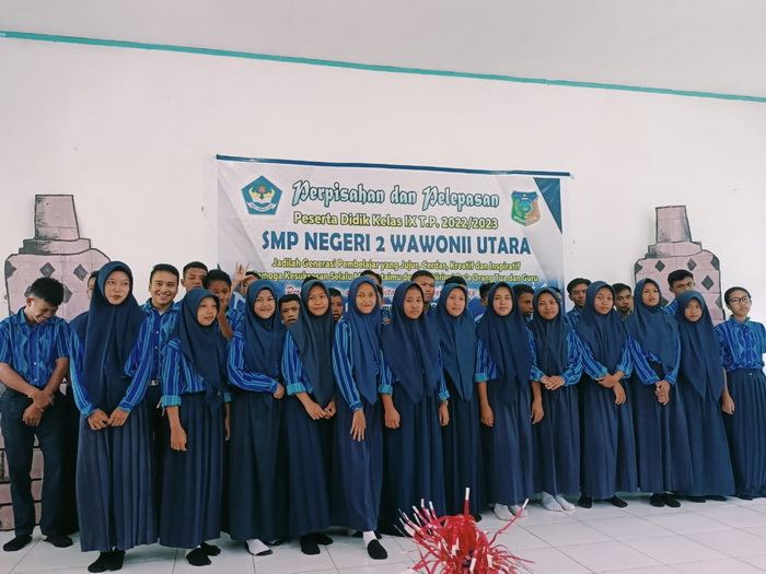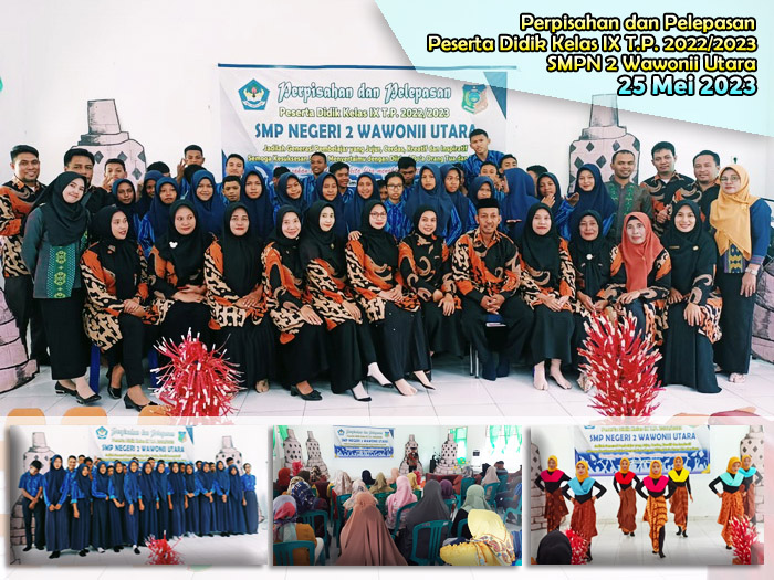Kamis, 25 Mei 2023, SMP Negeri 2 Wawonii Utara menggelar acara perpisahan dan pelepasan kelas IX Tahun Pelajaran 2022/2023. Kegiatan ini mengusung tema “Perpisahan ada agar kita bisa menghargai setiap pertemuan”. Hadir dalam kegiatan ini seluruh peserta didik kelas IX, orang tua peserta didik, guru dan tenaga kependidikan SMPN 2 Wawonii Utara, Kepala Puskesmas Lansilowo serta para kepala desa. Adapun susunan acara kegiatan ini adalah : 1. Pembacaan Doa oleh Bpk. Ansarullah TM., S.Pd, Gr. 2. Laporan Ketua Panitia oleh Bpk. Sumantri, S.Pd, Gr. 3. Ucapan selamat oleh Kepala SMPN 2 Wawonii Utara, Bpk. Asriadi Hambali, S.Pd 4. Ucapan selamat oleh Ketua Komite SMPN 2 Wawonii Utara, Bpk. Drs. Abdul Waris 5. Kata Pamitan yang disampaikan oleh perwakilan peserta didik kelas IX, Muh. Afrianto Fahrullah 6. Paduan suara kelas IX 7. Puisi Perpisahan yang bacakan oleh peserta didik kelas IX, Nur Insani Aulia Irwan 8. Tari Kreasi oleh peserta didik kelas VIII 9. Acara makan bersama Saat penampilan paduan suara dan pembacaan puisi, tangis haru pecah baik peserta didik, orang tua, guru maupun tamu undangan lainnya yang sempat hadir. Ini menunjukkan betapa kuatnya jalinan kekeluargaan diantara peserta didik dengan guru SMPN 2 Wawonii Utara. Tiba saat penampilan tari kreasi, seluruh yang hadir dalam acara sangat antusias menyaksikan dan mengubah suasana haru jadi decak kagum. Bahkan orang tua peserta didik meminta agar penampilan tari kreasi diulang sekali lagi. “Masih ingin nonton sudah selesai, sebagus ini tariannya mohon diulangi lagi” suara yang terdengar dari orang tua peserta didik. Akhirnya tari kreasi tampil untuk kedua kalinya dan kembali mengundang decak kagum seluruh yang hadir. Acara perpisahan dan pelepasan kelas IX diakhiri dengan kegiatan makan bersama yang telah disiapkan panitia bekerja sama dengan orang tua peserta didik. (atm)